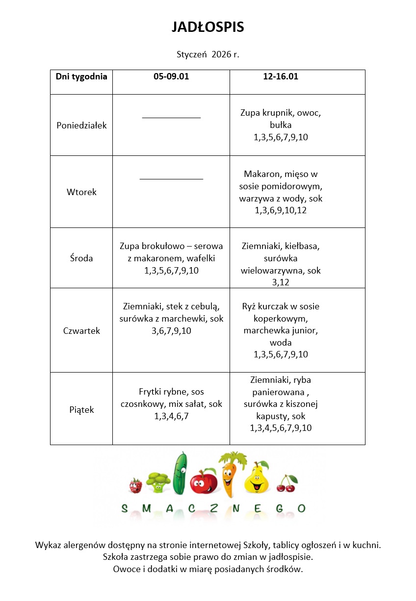 JADŁOSPIS & KOSZT OBIADU ZA STYCZEŃ 2026